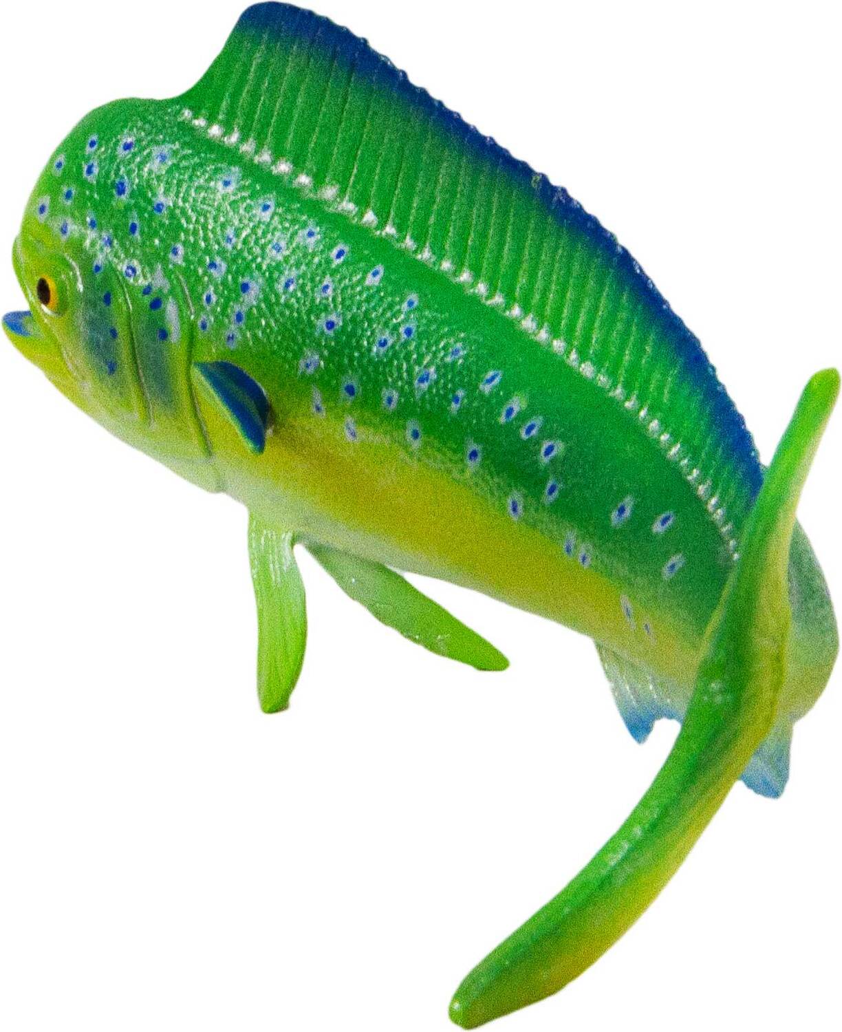 Characteristics: This Mahi-Mahi toy fish figurine features accurate and realistic details that highlight the distinct features of this popular fish. This includes its prominent forehead, long dorsal fin that runs nearly the full length of the fish's body, sharply forked tail, and vibrant coloration that includes electric blues, verdant greens, and shimmering yellows.