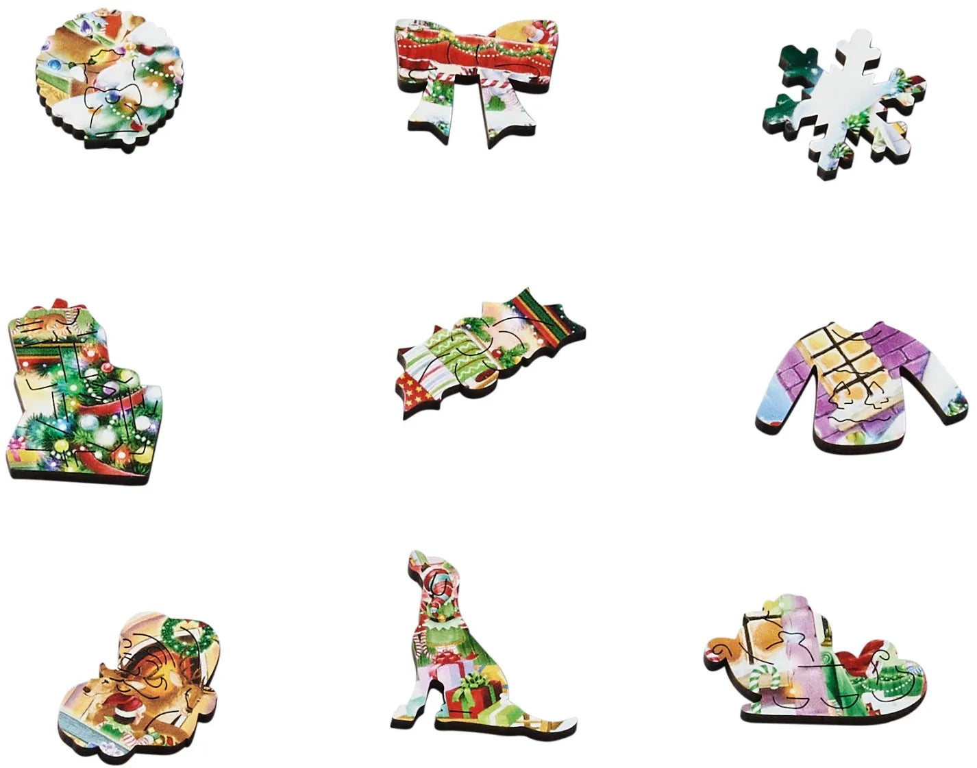 Step into the wonderful world of Santa's Workshop with this colourful Christmas jigsaw puzzle. Filled with festive whimsies irregularly shaped puzzle pieces and 'Merry Christmas' message pieces. This charming wooden puzzle captures the excitement of Christmas Eve.
