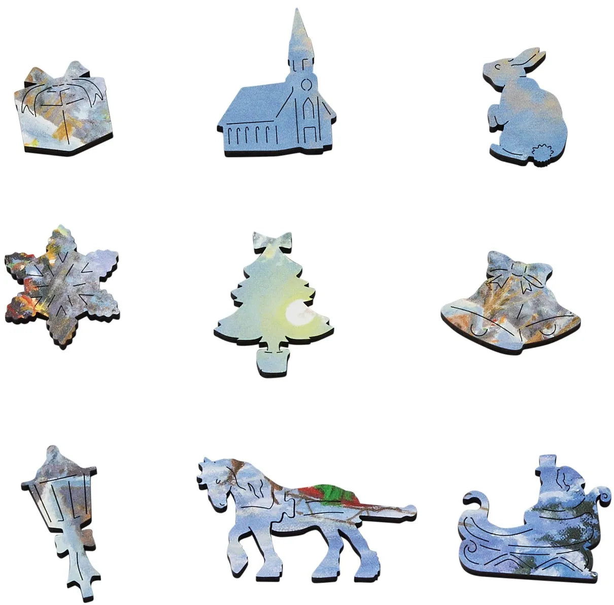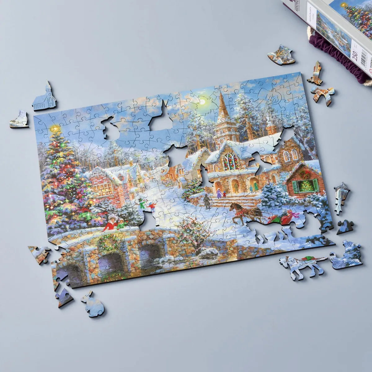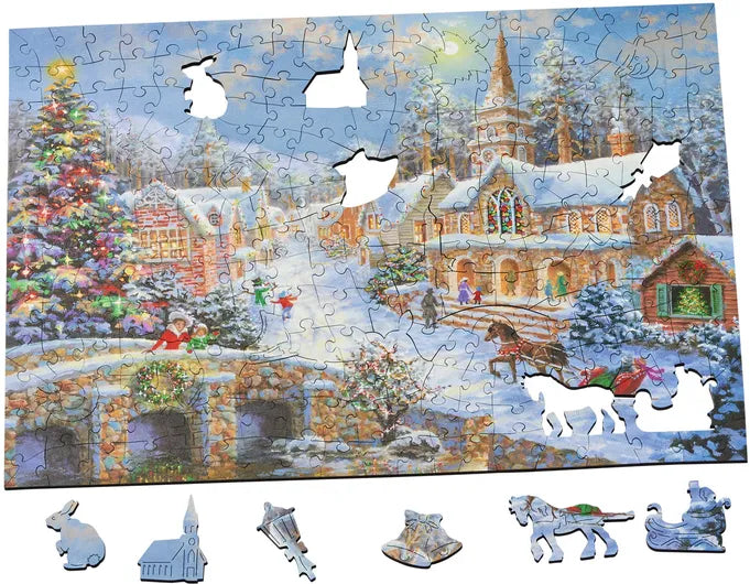 Nicky's paintings of quaint and quiet village scenes are awash with dramatic light and flecked with vibrant colours, they make for idyllic, romantic images that are perfect for puzzles. This traditional Christmas countryside scene is complimented by themed whimsies inspired by the season, perfect for any festive fanatic and jigsaw lover alike.