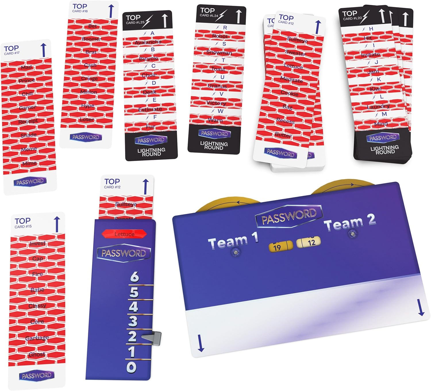 • Includes: 50 Game Cards (25 Double-Sided Password Cards, 25 Double-Sided Lightning Round Cards), 1 Decoder Sleeve, 1 Tracker Clip, 1 Score Tracker, Instructions
