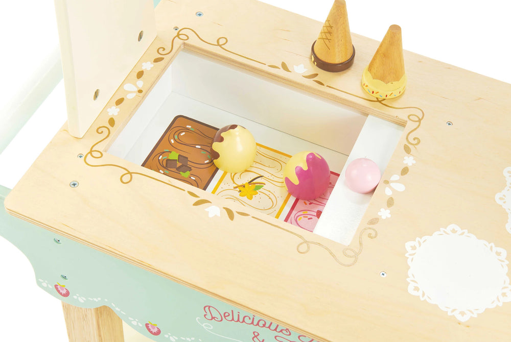 Le Toy Van Honeybake Wooden Ice Cream and Treats Trolley is a delightful vintage wooden barrow style trolley designed to encourage kids to engage in interactive roleplay and enhance their communication skills. With a striped fabric canopy and sliding door access to the frozen compartment, imaginative play will be further encouraged with the addition of illustrated with classic ice-cream flavours displayed on the door. The set includes 2 magnetic ice-cream cones