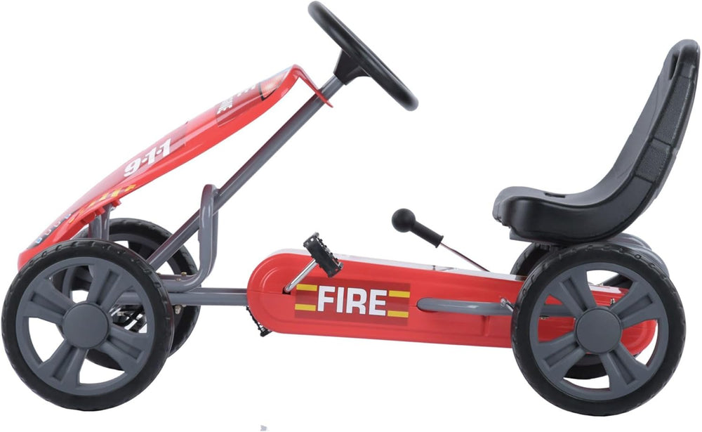 - DESIGN: Features Firetruck inspired Graphics on front fairing, 4 Spoke Rims with 10 inch EVA Wheels, 3-point sporty steering wheel, hand brake with 8 ball design and steel tube powder-coat frame.