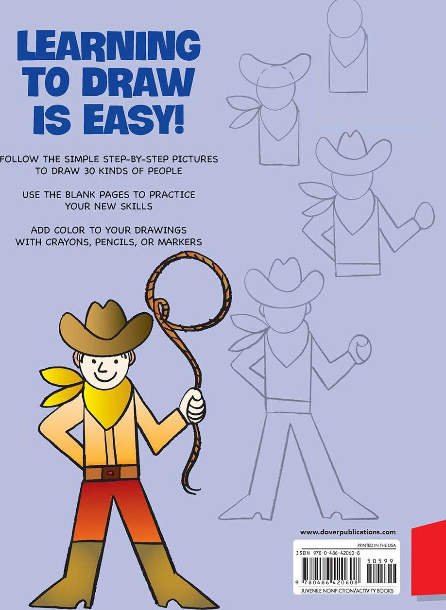 By joining circles, ovals, rectangles, cylinders, and other common shapes, even the budding artist can easily create 30 different characters — a fireman, a drummer, a mailman, a cowboy, an astronaut, a roller-skating girl, a boy on a swing, and more. Simple directions, step-by-step illustrations, and blank practice pages make it even easier. You can color the pictures when you are done — it's a fun-filled way to teach art to young children or a beginner that enjoys drawing.