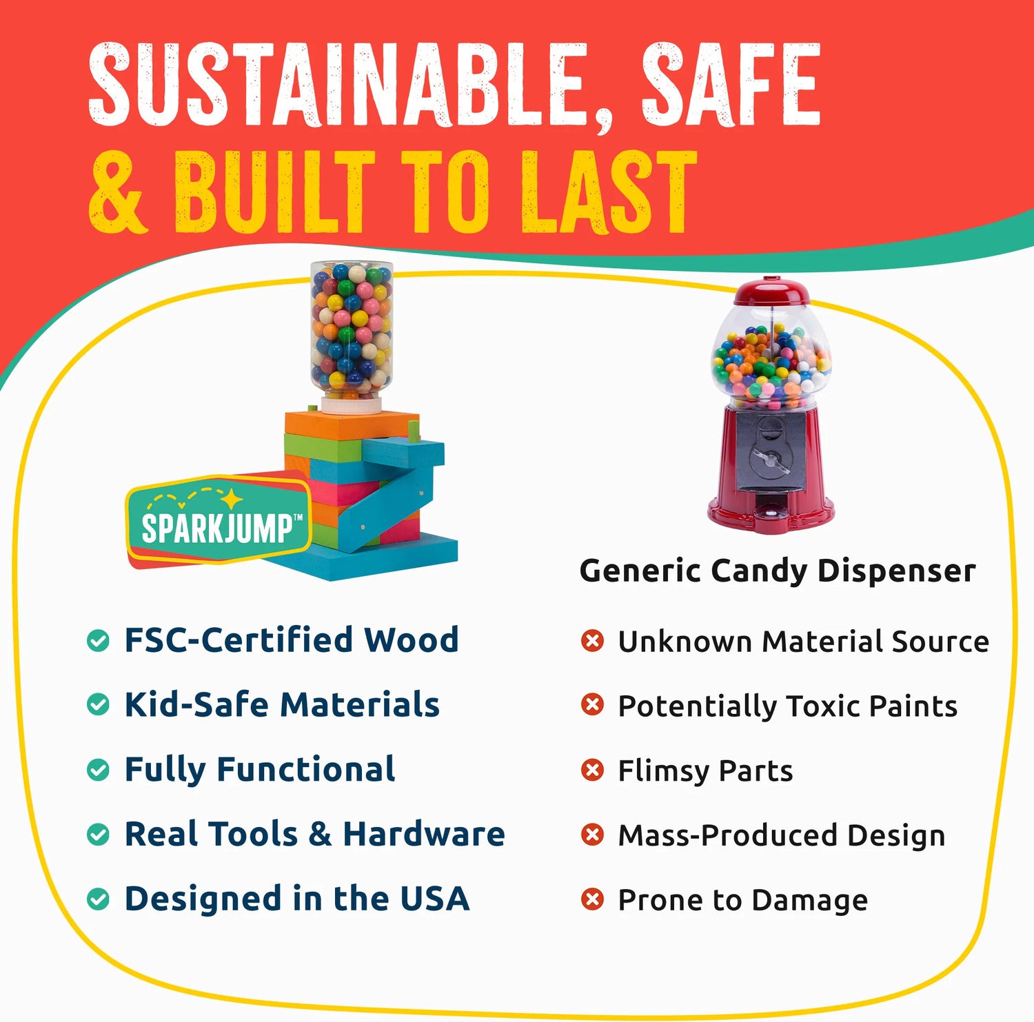 Designed for young builders, the SparkJump Candy Dispenser Kit is a fun, hands-on project that combines creativity, engineering, and family bonding—all in one sweet package! 🌿 Made with 100% FSC Certified Sustainable Wood, ensuring an eco-friendly, high-quality product for your customers. All-Inclusive Awesomeness Includes 16 wood pieces, a 16-ounce plastic mason jar, 30 nails, a 6-color paint set, 2 brushes, 3 sandpaper pieces, and easy-to-follow instructions. (Hammer not included.) Skill-Building Fun This STEAM woodworking kit introduces kids to engineering principles while enhancing fine motor skills, problem-solving, and creativity in an engaging way.