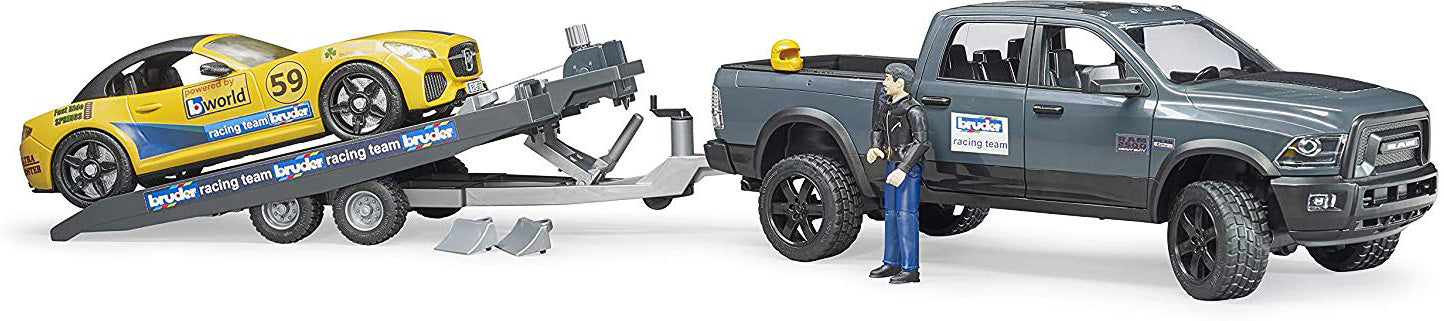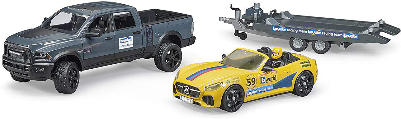 BRUDER is also not immune to this fascination. With the RAM Power Wagon including tuned Bruder Racing Team sports car there is a new, exciting vehicle and trailer for the bworld leisure themed world.