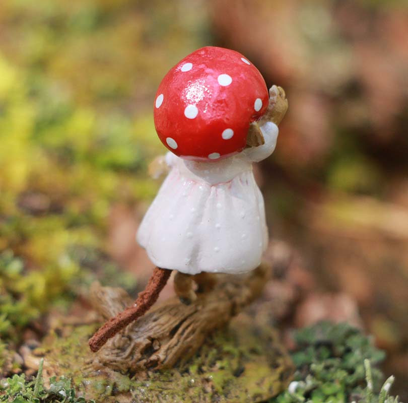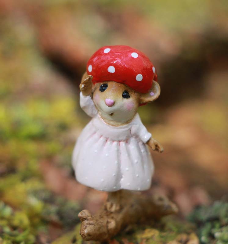 A cap made of a perfect red mushroom and a soft pink dress with tiny white polka dots keeps this mousey cozy as she balances on a woodland log without a care in the world. Sculpted by Willy. 1.75" x 1" Retired in 2025.