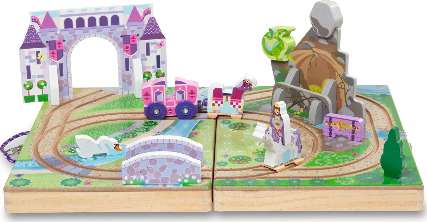 Features- 19-piece magical royal kingdom play set with wooden storage case that unfolds to create playing surface with built-in tracks