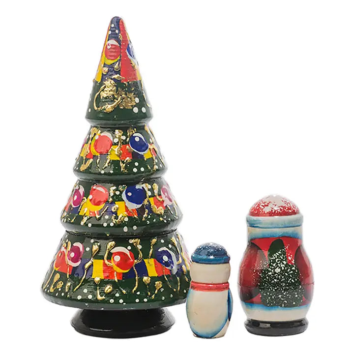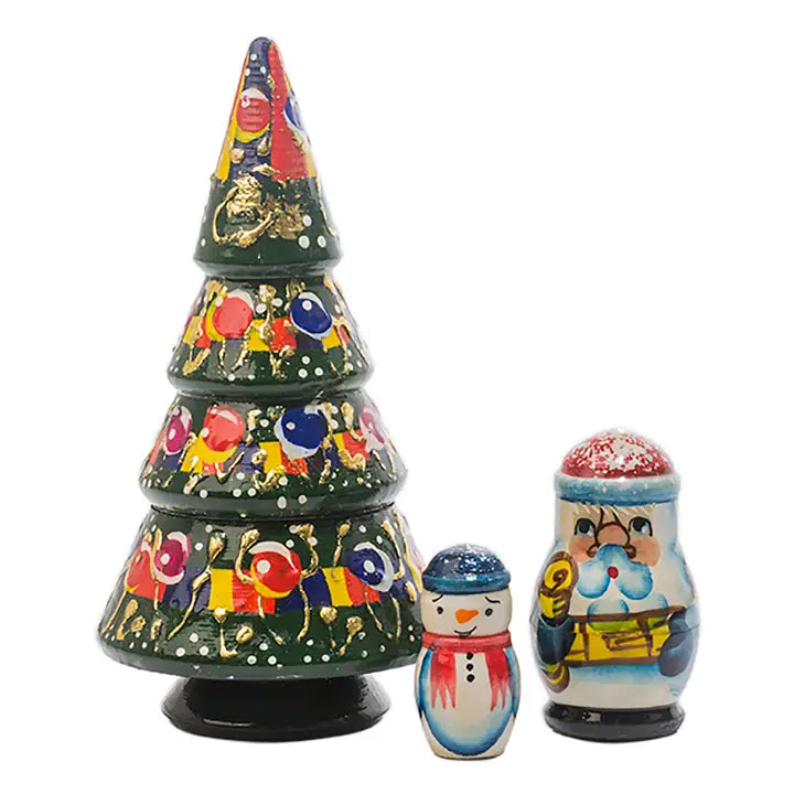 If the decorations of Christmas make you feel jolly, you'll want to take a look at this Christmas Tree Nesting Doll. The tree is adorned with beautifully hand-painted bulbs and tinsel. Open it up and you will see that Santa Claus is hiding in the tree and harbours a snowman within! A wonderful three-piece Christmas gift or addition to your holiday decor, this stacking Christmas tree is sure to fill you with holiday cheer.