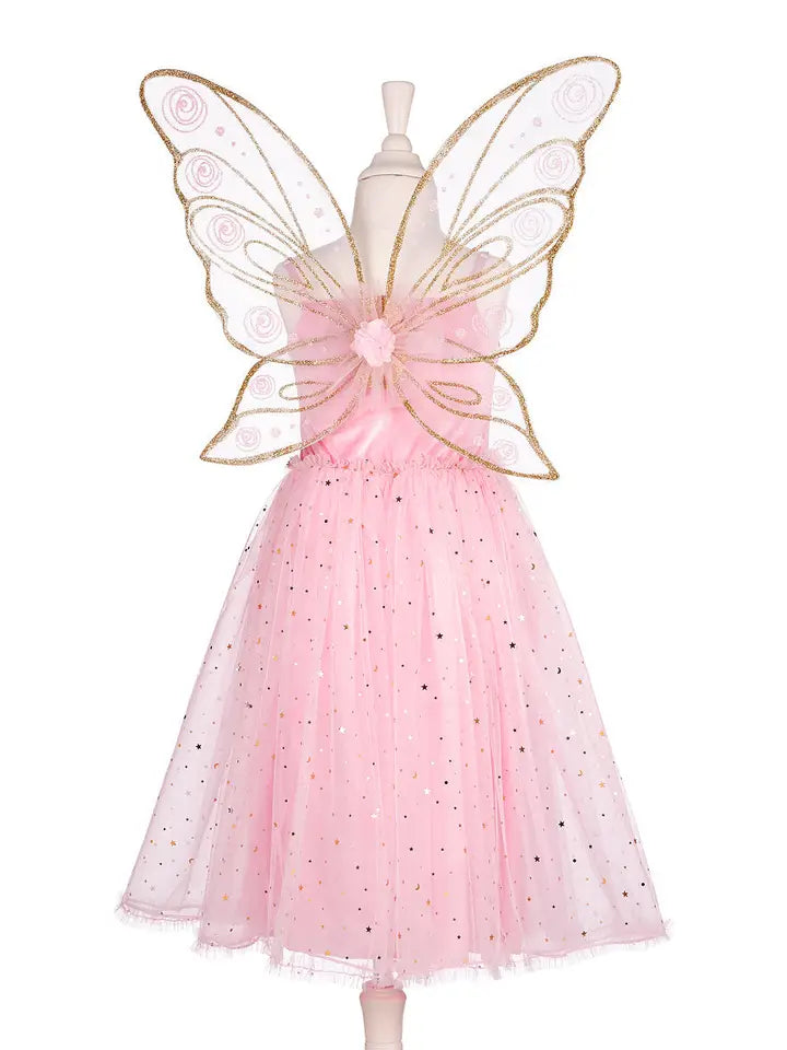 Adorable Souza costume depicting a beautiful fairy in pink with gold details.In a garden filled with twinkling petals and whispered wishes, the Rosyanne Dress with Wings brings fairytales to life. With soft pink tones, floral accents, and delicate matching wings, this enchanting outfit turns your little one into a garden fairy ready to dance, twirl, and spread joy. Whether it’s a costume party, a birthday celebration, or simply a day of magical make-believe, this dress invites imagination to blossom. Features: Soft, flowing pink dress with floral details. Includes matching fairy wings.Perfect for dress-up, gifting, or fairy adventures...Because every flower fairy deserves to shine in her own story.