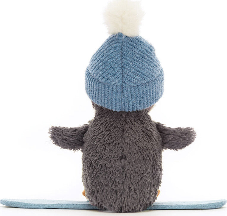 Peanut Penguin Snowboarding is ready to wobble down the slopes! Lovably soft in blue-grey fur, with a cream tummy, little flippers and orange beak and feet, our intrepid chick rides a blue suedette board. Wearing a cosy blue knitted hat with fluffy snowball pompom, this penguin's a gorgeous good-luck charm.