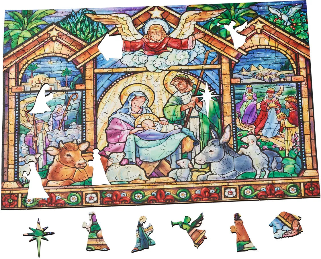 Piece together stained glass scenes of the most famous Christmas story, the nativity. Explore the intricate details and rich colours in this wooden jigsaw puzzle and discover the hand-crafted whimsy pieces that match the theme of the image.
