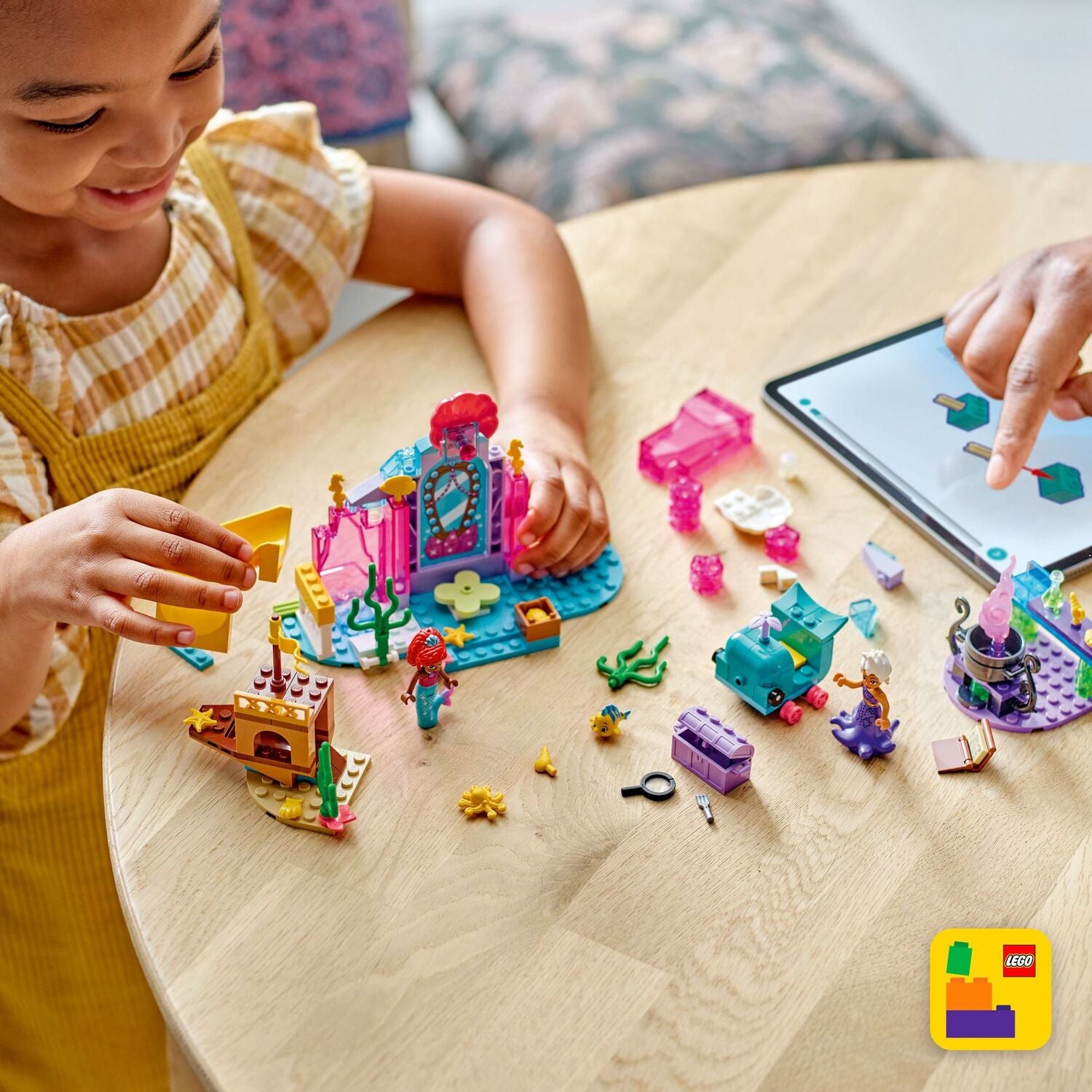 Exploration and play awaits kids aged 4+ as they learn to build with this LEGO Disney Princess Ariel's Crystal Cavern (43254) building toy. This buildable mermaid playset gift helps boost kids' problem-solving skills with creative play. Inside is a cavern with a spinning platform and slide, a whale vehicle, a shipwreck with a treasure chest and a cauldron. It also includes Ursula and Ariel LEGO Disney mini-doll figures and a Flounder LEGO Disney fish figure.