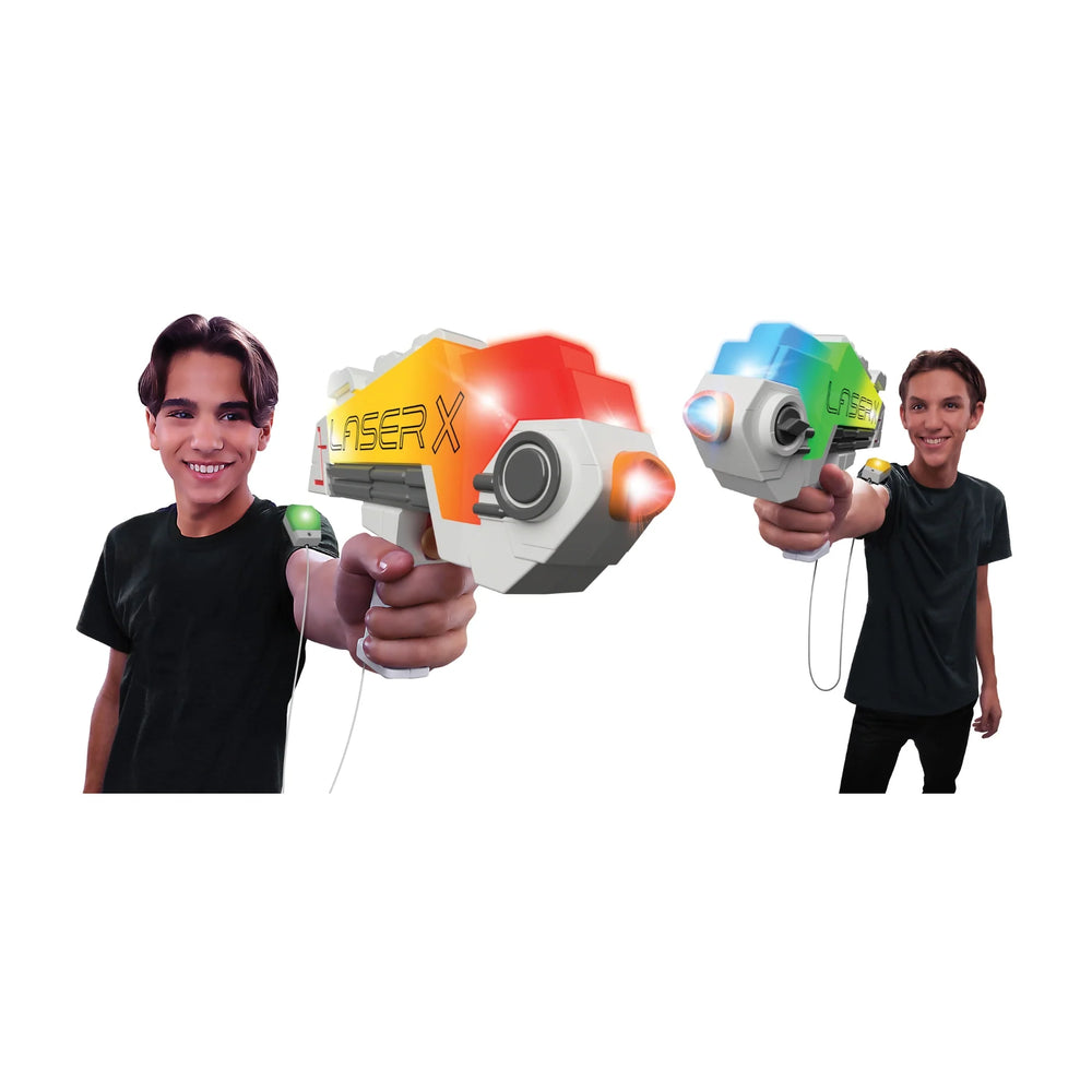 Have fun indoors or outdoors, day or night with Laser X Double B2 Blasters! Features a blast range of up to 300 feet and a quick slide blaster reload for up to 10 blasts. Choose your team colors using ultra mode to cycle through over 20 color combinations for multi-player play. Includes a set of blasters measuring 10.75 x 2.25 x 7